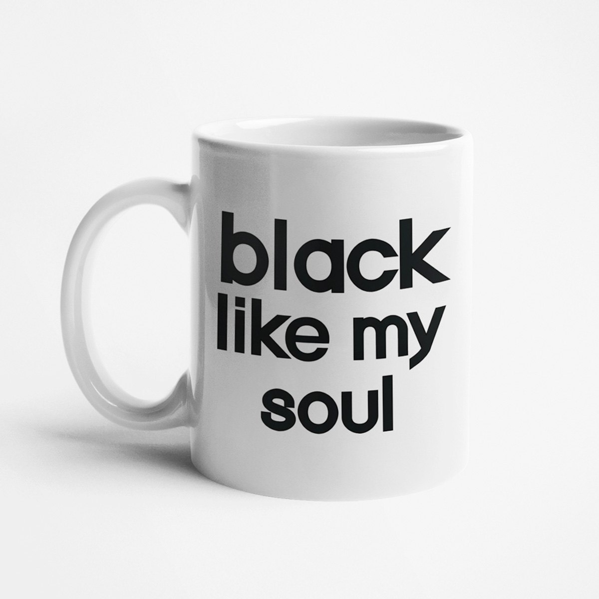 Muki, Mustana kiitos. Black like my soul, valkoinen kuppi mustalla mielellä. Vetoisuus 330 ml, konepesunkestävä.
