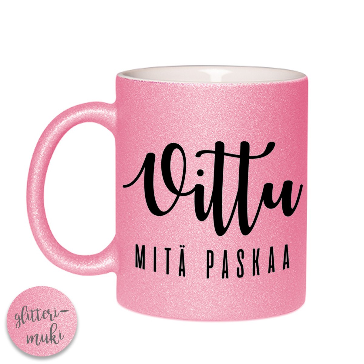 Muki, Vittu Mitä Paskaa, Pinkki paska. Vaaleampi pinkki glitterillä. Astetta kauniimpi asennemuki. Glitter-pinnan vuoksi käsinpesu suositeltavaa. Vetoisuus 330 ml.