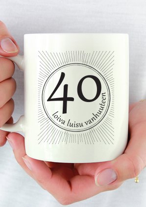 Muki Pyöreät päivät 40. Juhlan paikka ! Tasaluvulla loivaan luisuun.. ja tietty alaspäin ! Konepesun kestävä muki lasitetulla pinnalla.