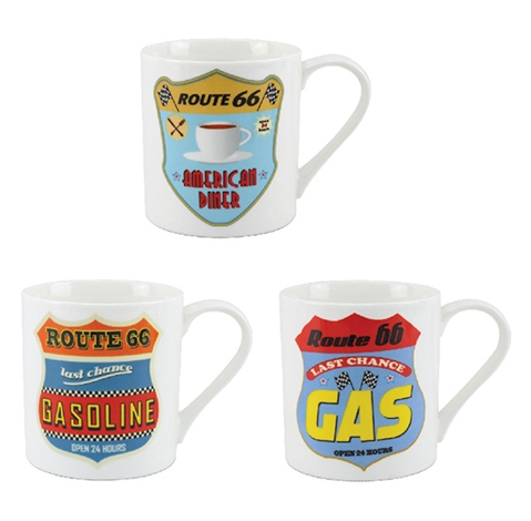 Muki, Route 66, erilaisia. Mikron ja tiskikoneen kestävät Route 66-retromukit. Saatavilla kolmea erilaista kuosia. Muki on ns. jättikokoinen. Toimitetaan hienossa pahvirasiassa.