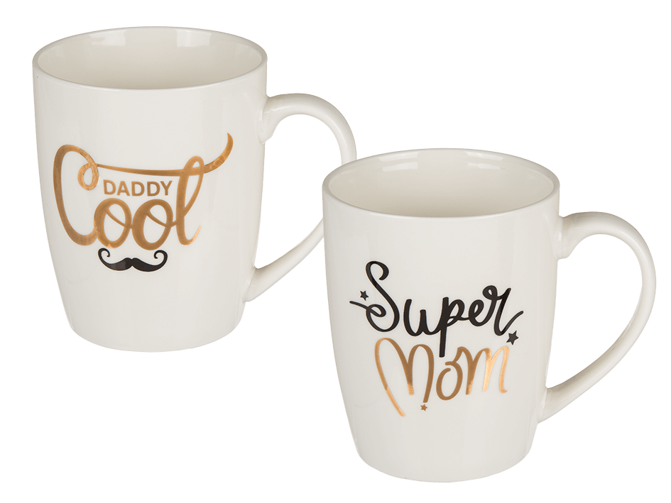 Muki, Super Mom / Daddy Cool. Valkoinen muki, jossa teksti Super Mom tai Daddy Cool. Valittavanasi on siis kahta erilaista mukia. Emme suosittele mukin pesua tiskikoneessa.