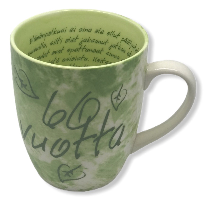 Muki tekstillä: 60 vuotta. Mukin sisällä runo. Toimitetaan lahjapakkauksessa.