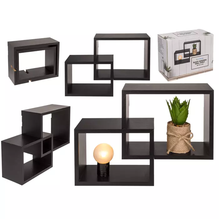 Musta seinähylly 2-setti. Kaksi pientä mustaa suorakulmion mallista seinähyllykköä. Mitat n. 17 x 13 x 9 cm ja 19,5 x 15,5 x 9 cm.