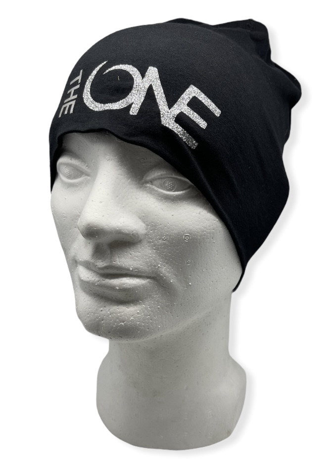 Musta trikoopipo The One. Trikoopipo Glitter-tekstillä, yksi koko. Napakkaa kaksinkertaista puuvillatrikoota. Pipon korkeus tasossa mitattuna n. 25 cm.