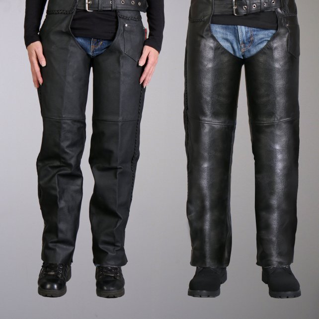 Nahkachapsit, Chaps Braided, Hot Leathers. Paksua nahkaa. Vyötärökaarrokkeessa ja housun pystysaumassa nahasta punotut palmikkoyksityiskohdat. Lahkeet saa auki avaamalla sivuissa olevat leveät metalliketjut. Lahkeen alaosassa neljä krominväristä nepparia. Vyötäröllä kiristys/säätö takaosassa nyörityksenä ja etuosassa solkikiinnityksellä. Chapsien vasemmalla puolella paikkatasku.