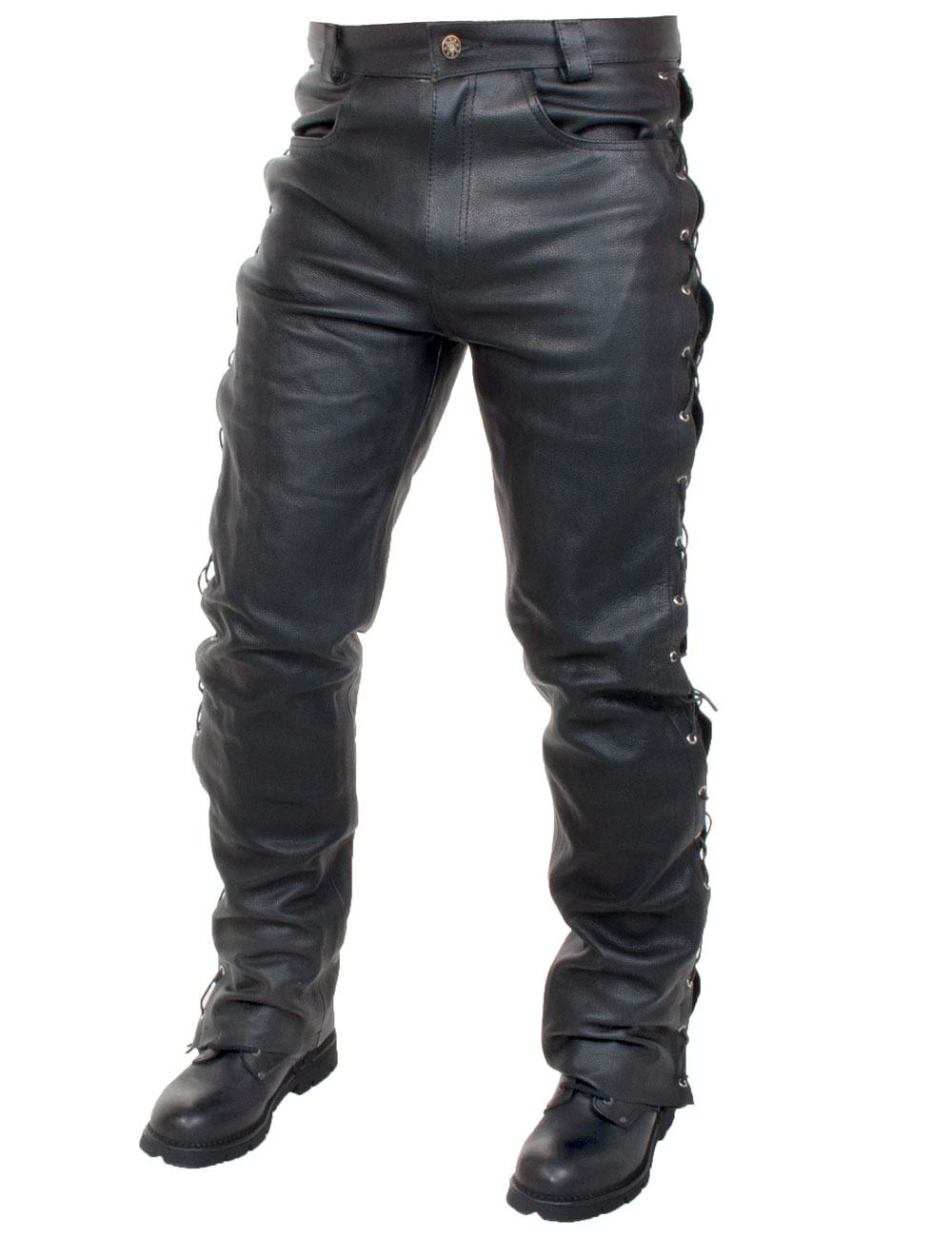 Nahkahousut nyöreillä, ajoon tai vapaa-aikaan. Bikerien ja rokkarien kestosuosikki!