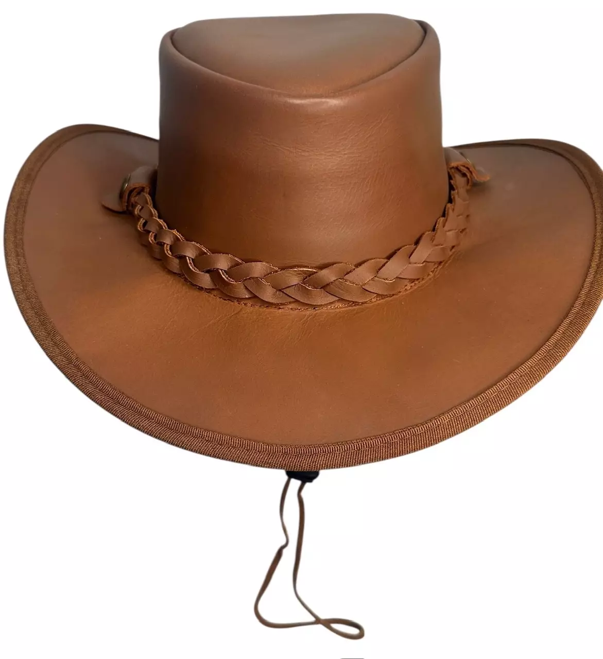 Nahkainen hattu, kamelinruskea. Hatussa somisteena palmikoitu, nahkainen hattunauha. Leukanarussa kiristin, jolla säätö on helppoa ja nopeaa.