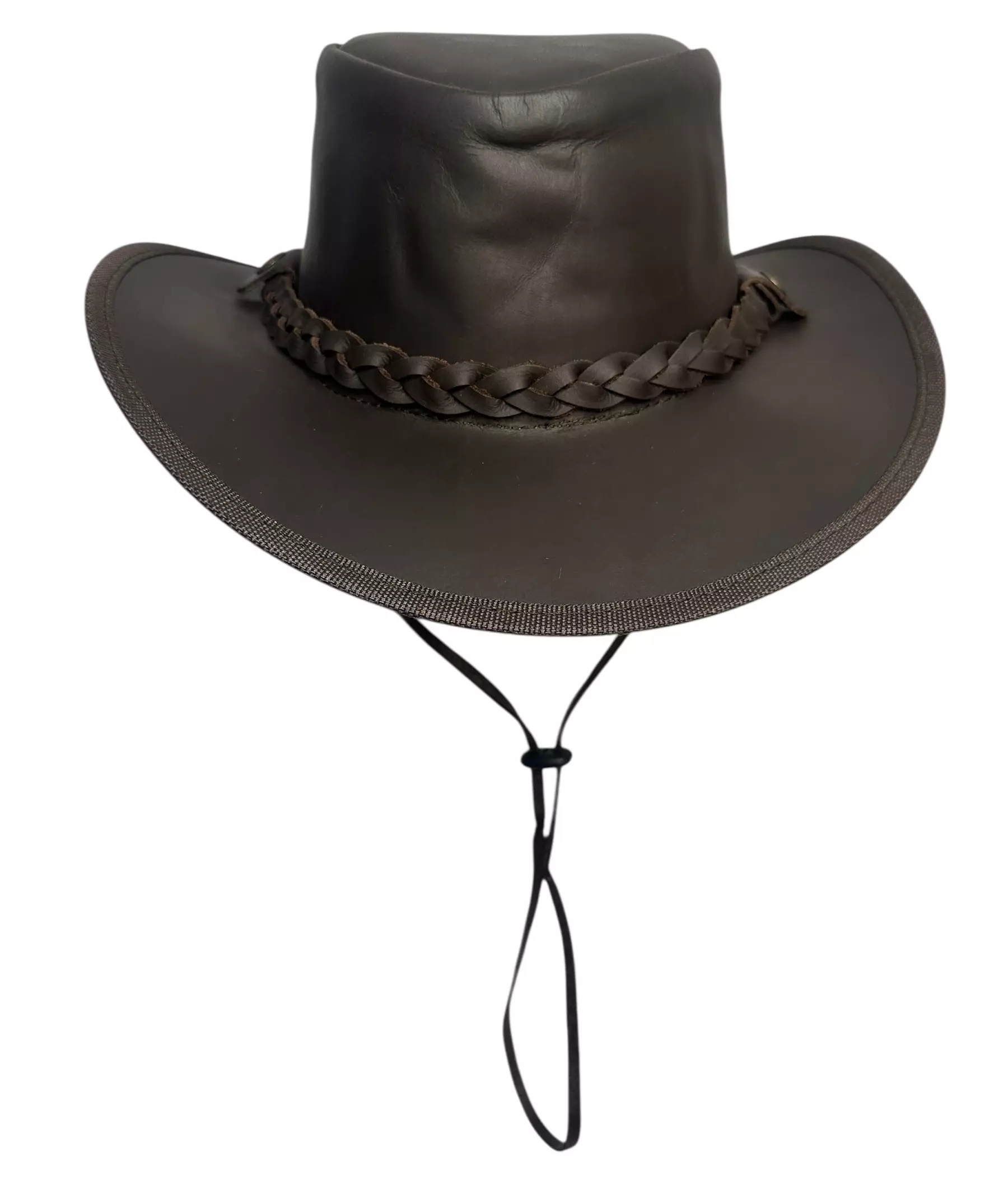 Nahkainen hattu, tummanruskea. Hatussa somisteena palmikoitu, nahkainen hattunauha. Leukanarussa kiristin, jolla säätö on helppoa ja nopeaa.