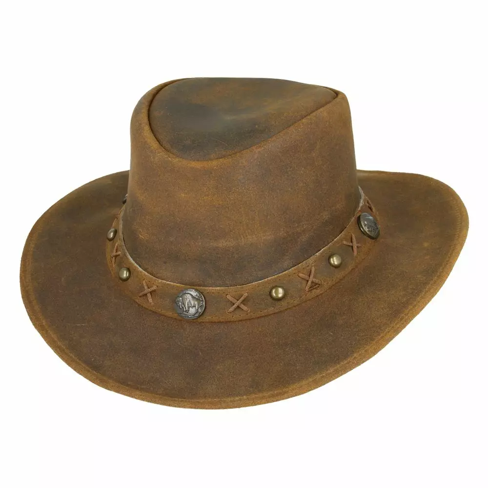 Nahkainen Western hattu, ruskea. Australialaistyylisen hatun reunakanttauksen sisällä on rautalanka jonka avulla hatun lieriä saa muotoiltua. Nahkaisessa leuanalusnauhassa on säädettävä kiristin, jonka avulla hatun saa pysymään päässä kovallakin tuulella. Hattuosan korkeus n. 10 cm ja lierin leveys n. 7,5 cm.