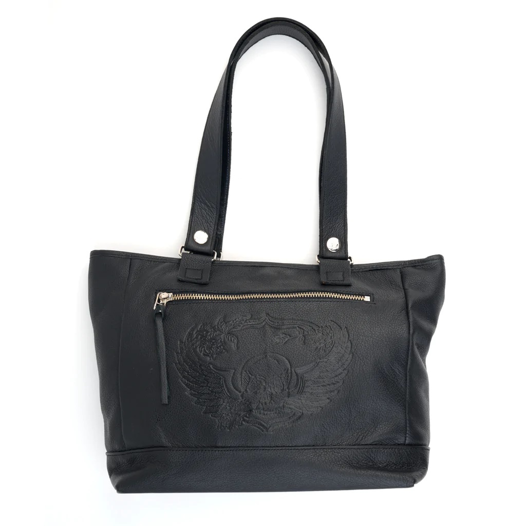 Nahkalaukku, kallo ja siivet. Musta laukku, jonka laukkutila suljetaan yhdellä magneettinepparilla. Laukun sisällä on vetoketjullinen tasku pikkutavaroille ja laukun etupuolella on myös vetoketjullinen pikkutasku. Laukun mitat 26,5 cm x 25 cm x 10 cm.