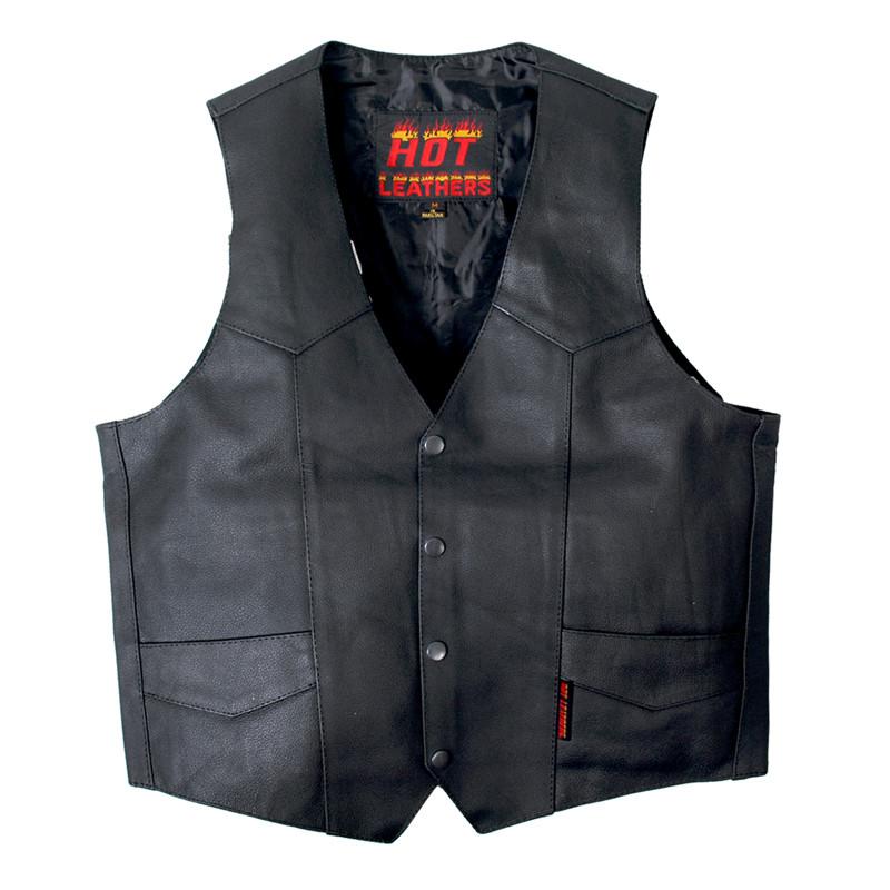 Nahkaliivi, Hot Leathers, Heavyweight. Tässä klassinen nahkaliivi ilman mitään ylimääräisiä krumeluureja. Nahka on naudannahkaa, vuori satiinia. Liivissä on povitasku sekä kaksi sivutaskua. Nepparikiinnitys.