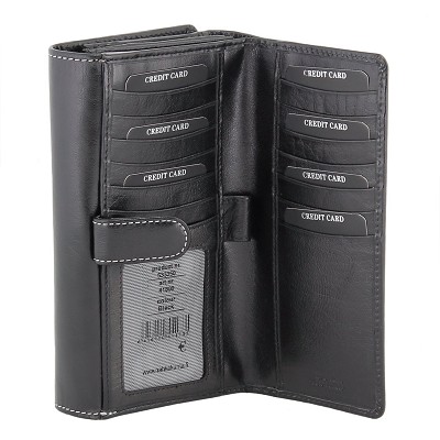 Nahkalompakko. RFID suojattu. 27-korttipaikkaa, 2-vetoketjullista osastoa. Muita taskuja paljon, kynälle oma lenkki. Todella reippaan kokoinen.