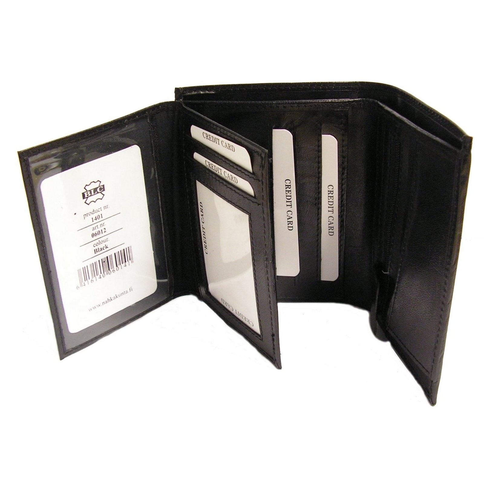 Nahkalompakko, RFID suojattu, musta . RFID-suoja tarkoittaa suojausta, jonka ansiosta pankki- ja luottokkortteja ei voi skannata lompakon läpi (lompakossa suojakalvo lompakon nahan sisällä).