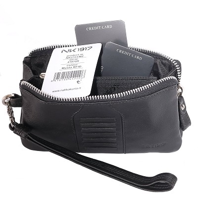 Nahkalompakko RFID suojattu. Laadukasta mustaa pehmeää nahkaa. Todella laadukas kokonaisuus. Iso lompakko. Vetoketjulla keskeltä avautuva, kahdeksi ns osaksi. Sisällä reilustui tilaa korteille. Ulkopuolella Vetoketjullinen tasku. Sisällä vetoketjullinen tasku. Irroitettava nahkainen ranne nauha. LEVEYS = 17cm KORKEUS = 10cm