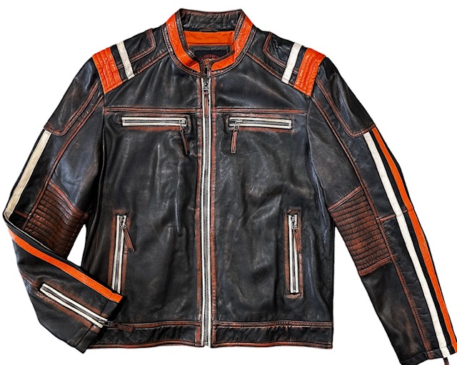 Nahkatakki antiikkiruskea- oranssi. Takin nahka on pehmeää lammasnappaa. Edessä, taskuissa ja hihansuissa on leveät metalliset vetoketjut. Yksityiskohtina tikkauksia ja kontrastiraitoja. Oranssi vuori 100 % puuvillaa, hihan vuori liukkaampaa 100 % polyesteria. Vuorissa povitaskut molemmin puolin, toinen vetoketjulla, toinen listatasku ilman ketjua.