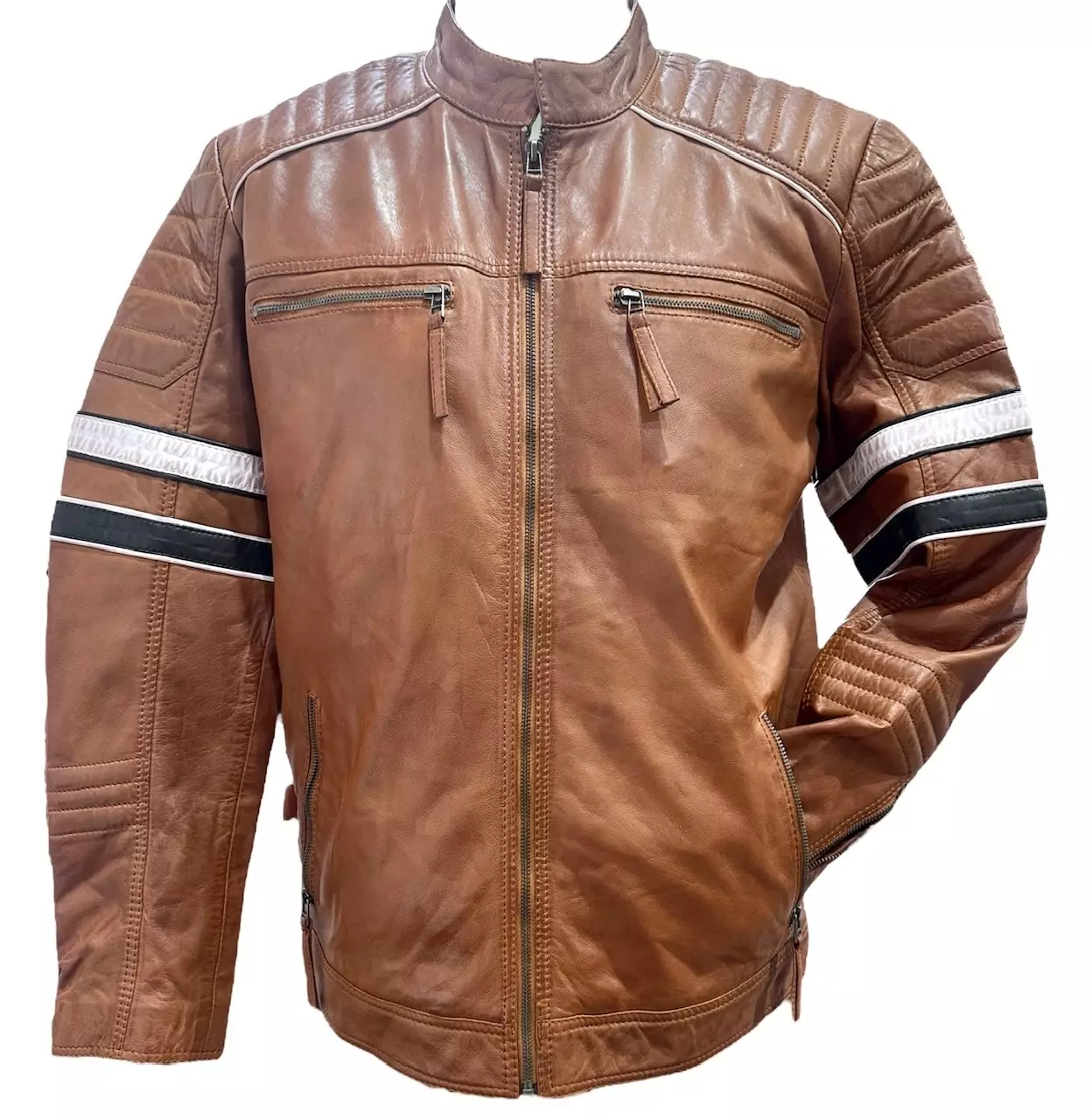 Nahkatakki Bugatti Cognac. Konjakin värinen miesten nahkatakki hiharaidoilla, pehmeää lampaannappaa. Kaksi vetoketjullista etutaskua, hihansuissa vetoketjuhalkiot ja takin helmassa sivuissa nepparitampit väljyyden säätämistä varten. Vuorissa povarit molemmin puolin etuketjua, toinen vetskalla, toinen nappikiinnityksellä.