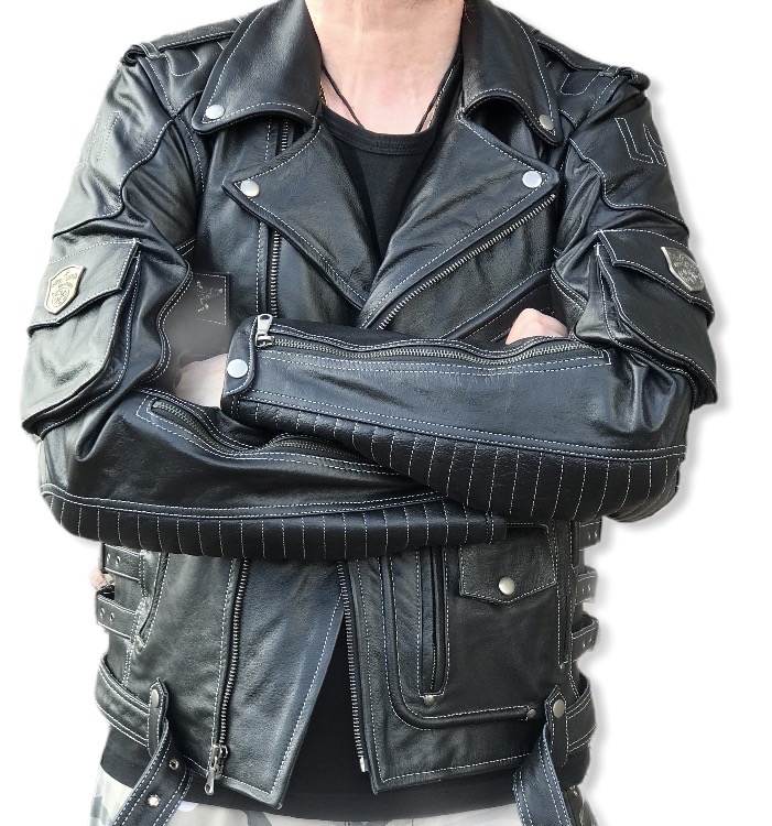 Nahkatakki irrotettavalla tikkivuorilla, mustaa nahkaa. Nahkatakki runsailla yksityiskohdilla, paljon taskuja, topattuja korostustikkauksia, solkia ja metallimerkkejä. Takissa vetoketjulla irrotettava tikkivuori, jossa on kaksi povitaskua kuten takissa itsessäänkin.