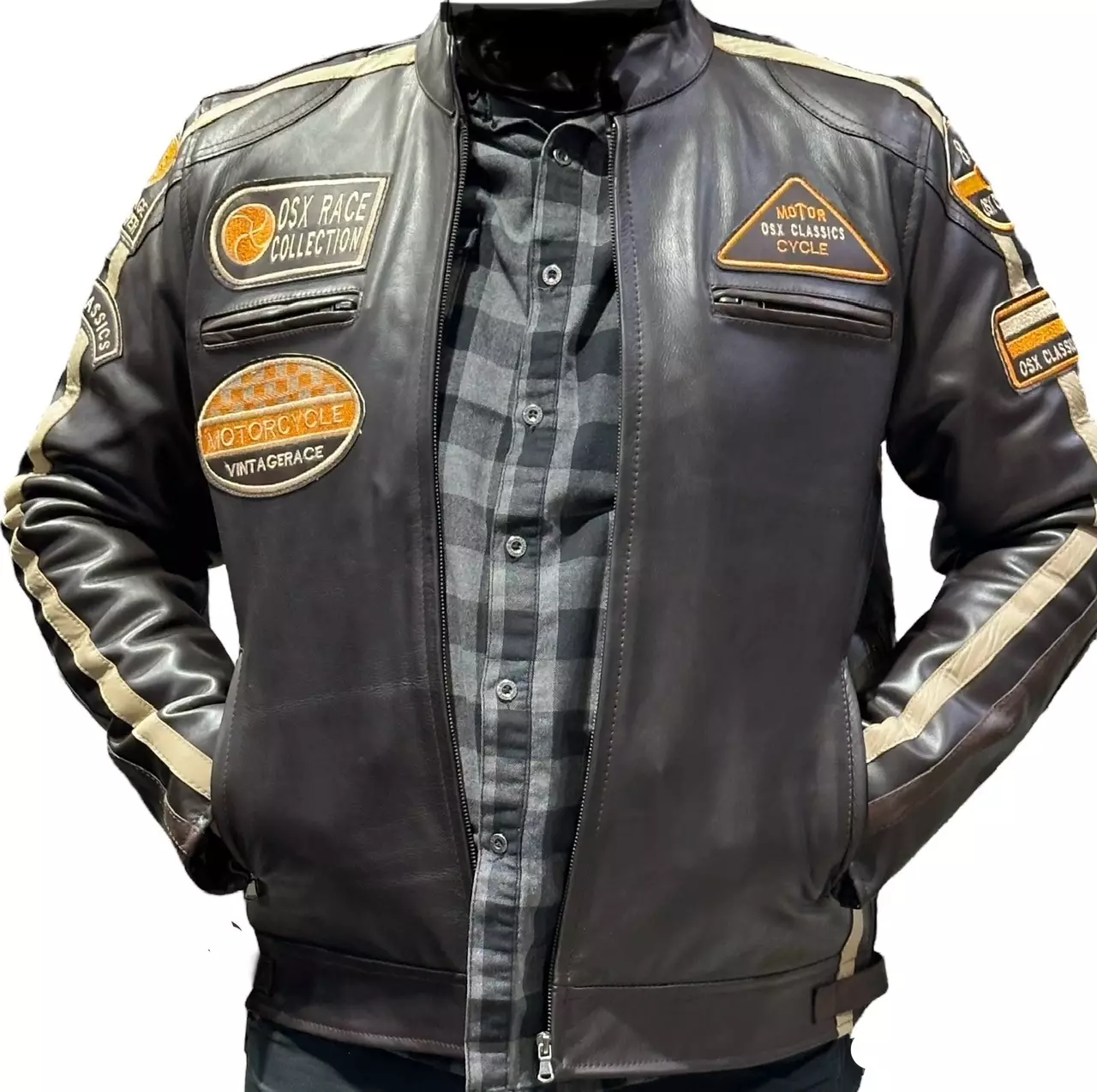 Nahkatakki JLI Brown waxy. Tummanruskea JLI-nahkatakki, jossa mallille tyypillisesti yksityiskohtina brodeerattuja kangasmerkkejä, sekä korostusväriset tehosteraidat hihoissa ja kyljissä. Lisäksi takissa on vetoketjulliset rintataskut, edessä alhaalla ketjuttomat listataskut ja helmassa sivuissa säätötampit neppareilla. Hihoissa ja sivusaumoissa on vetoketjulliset halkiot väljyyden säätämiseksi. Hihoissa on myös yksityiskohtana vetoketjulliset "taskut" kyynärpäiden kohdalla, ne eivät kuitenkaan ole suojuksia varten. Vuorissa on povarit molemmin puolin etuketjua. Toisella puolella vetoketjullinen tasku sekä lisäksi pieni paikkatasku, ja toisella puolella listatasku ilman vetoketjua.