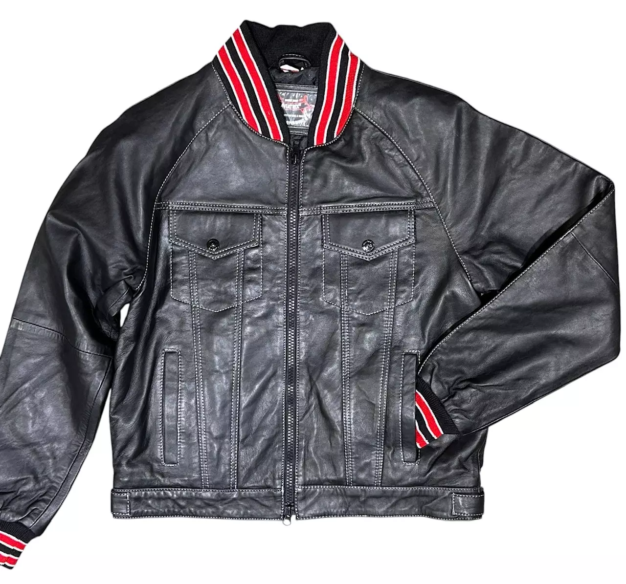 Nahkatakki Mason, musta nahka. Lyhyt farkkutakki-tyyppinen nahkatakki, jossa on raidalliset resorit pääntiellä ja hihansuissa. Resoreissa on tehosteväreinä punaista ja valkoista.