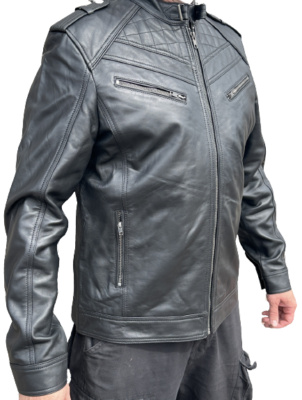 Nahkatakki musta läpivärjätty lampaan nahka takki. Pystykaulukset. Povitaskut molemmin puolin, toinen vetoketjullinen. Suora perusmalli, rento istuvuus. Pelittää hieman pidempi kätisellekin.