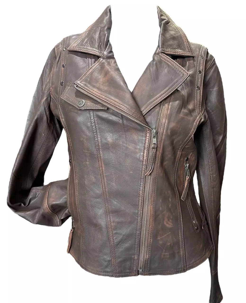Nahkatakki Ready-3, antiikin ruskea. Naisten nappanahkainen prätkärotsimalli, jossa sivuissa nyöritys. Kevyt ja miellyttävän pehmeä takki.