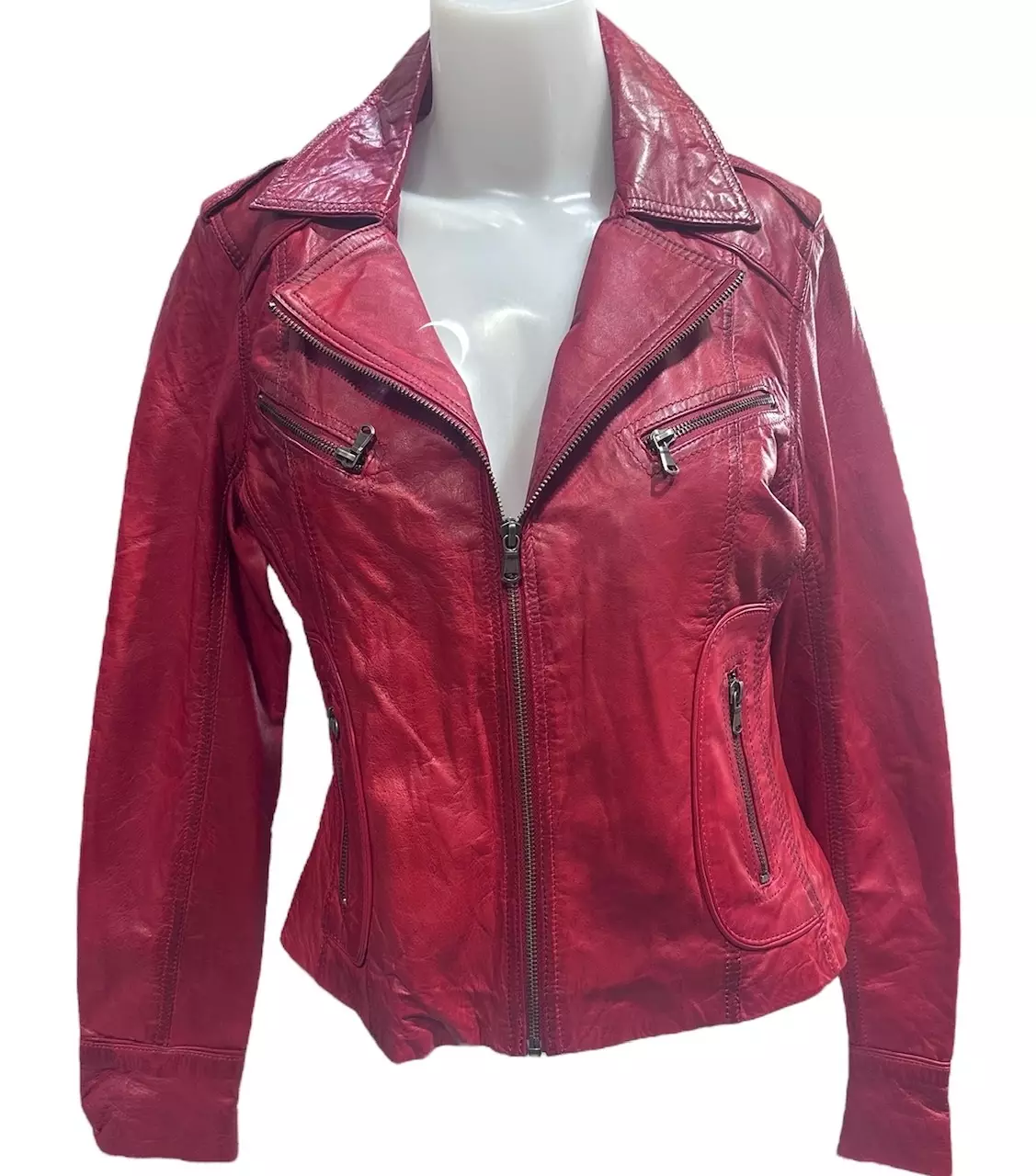 Naisten nahkatakki, pehmeää lampaan nahkaa, Red nappa sheep. Punainen nahkatakki, naisten tyköistuva malli. Kannattaa valita yksi koko isompi kuin normaalisti käytät.