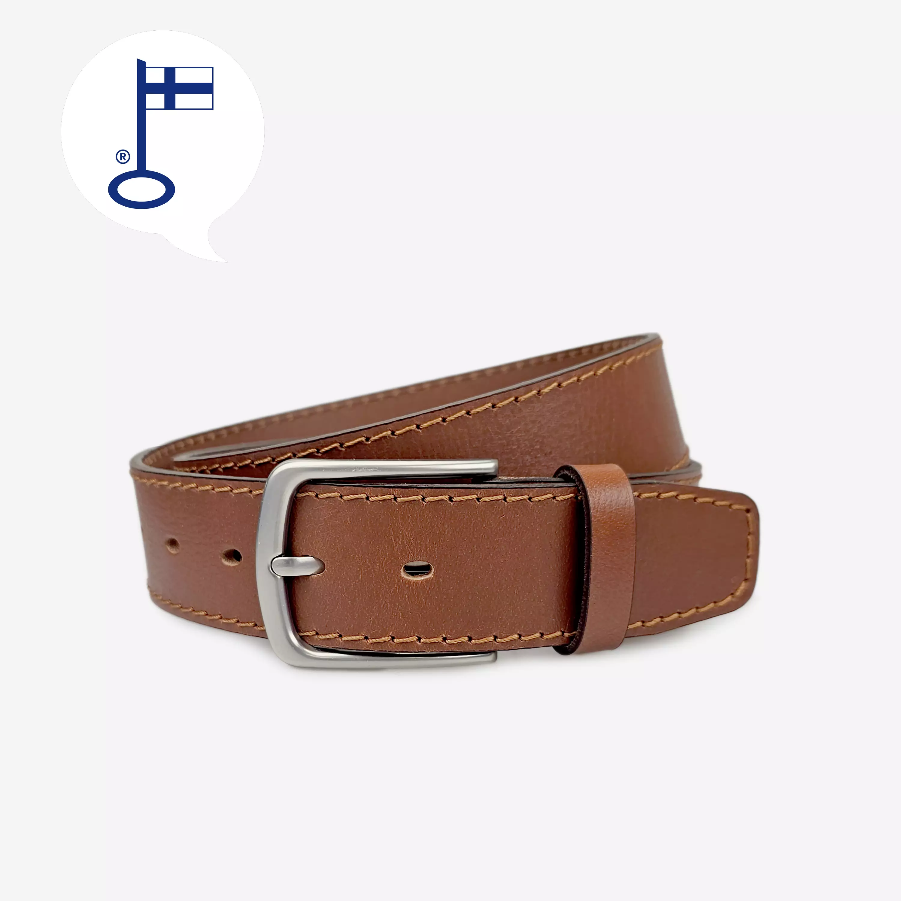 Nahkavyö 40 mm, tikattu. Konjakinruskea, Klassinen vyö vaalein koristetikkauksin. Solki on nikkelivapaata metallia.