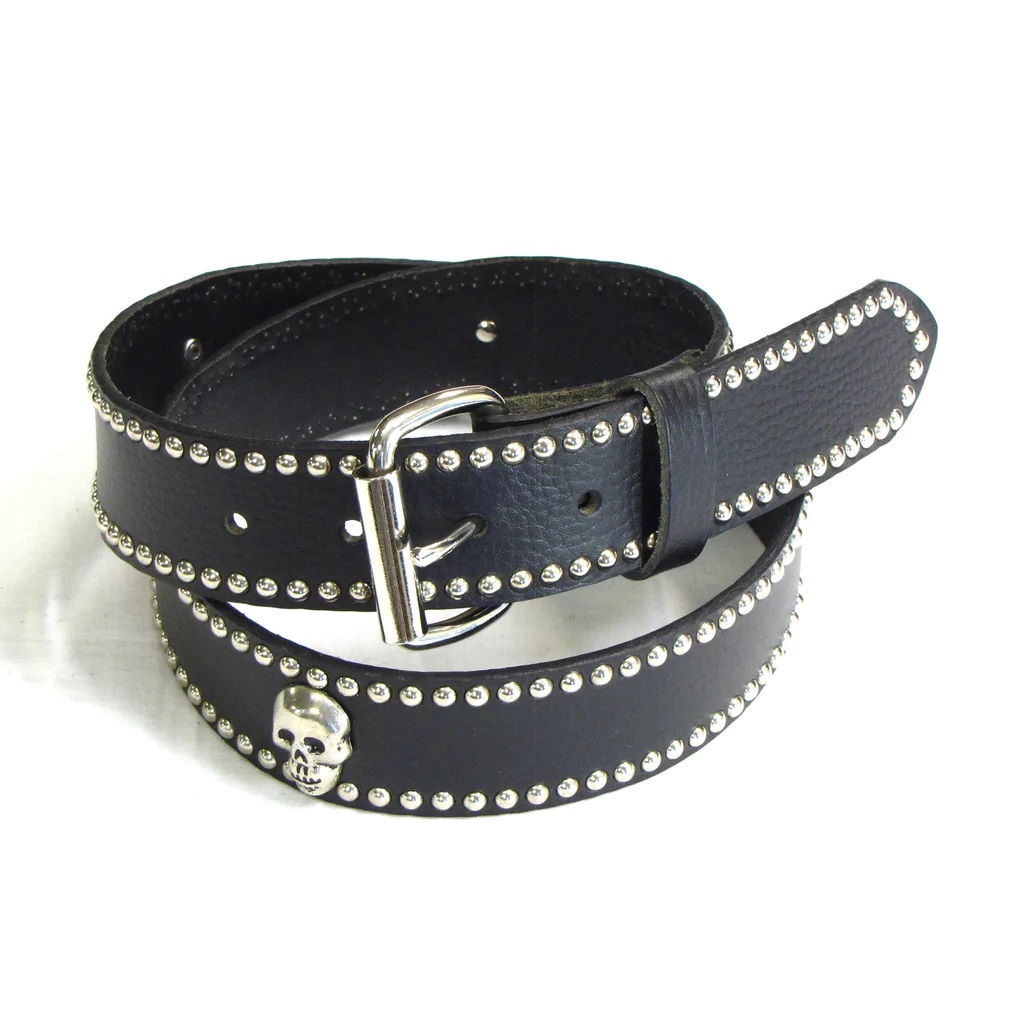 Nahkavyö Kallo Conchot, musta. Upea nahkavyö, jossa mustan vyön ylä- ja alareunaa koristaa krominvärinen niittirivi ja vyön keskiosassa on tyylikkäät kalloniitit. Vyön leveys 3,75 cm. Solki on irroitettavissa neppareilla, joten vaihtosolkia on helppo ja nopea käyttää. Made in USA.