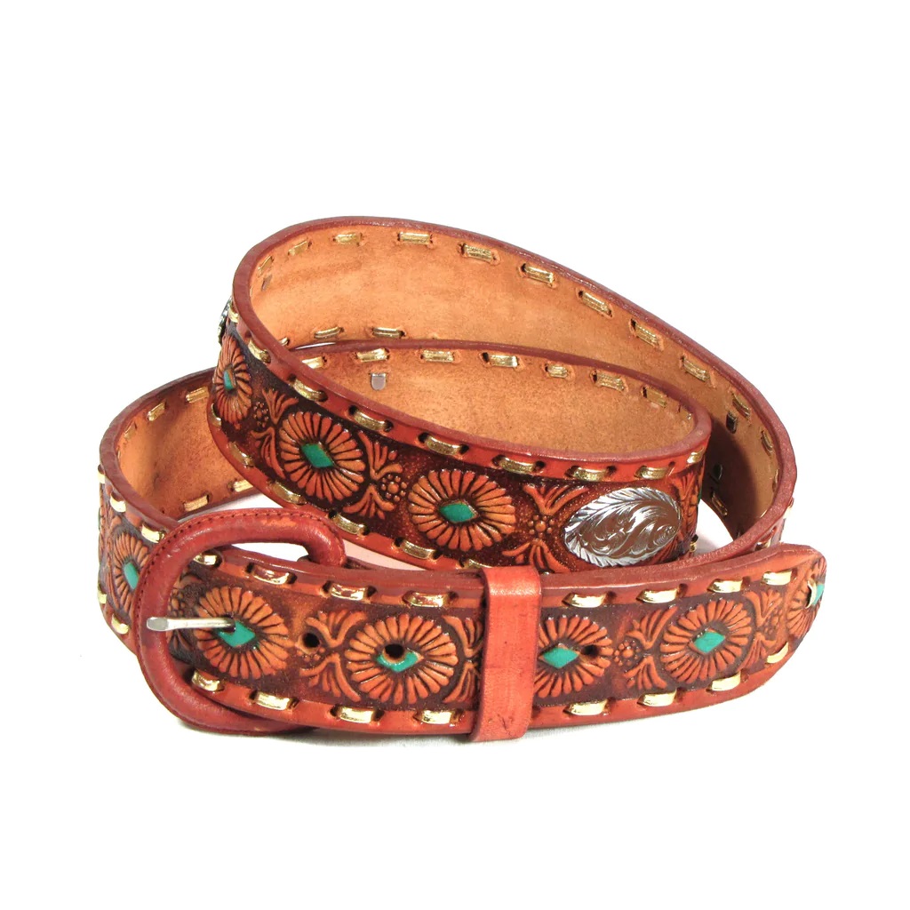 Nahkavyö Mexican, ruskea. Meksikolaishenkinen vyö krominvärisin Concho-koristein. Vyön leveys 3,75 cm (1,5"). Made in USA.