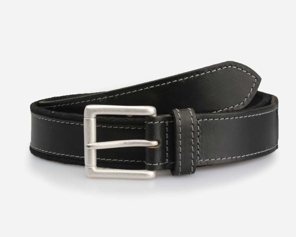 Nahkavyö mustalla kangas taustalla. Musta nahkavalkoisilla tikkauksilla. Vyön koko tarkoittaa vyötärön mittaa, eikä vyön kokonais mittaa.