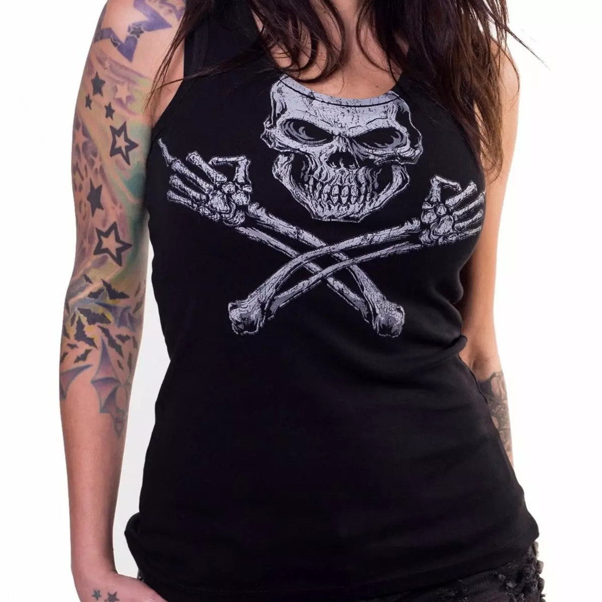 Middle Finger Skull "Man Beater" Tank Top Fabric - 100% per-shrunk cotton Style - Ribbed to stretch Graphics - Hand drawn art. Logo print on the back of the shirt Shirt Color - Black Sizing - true to... Lue lisää