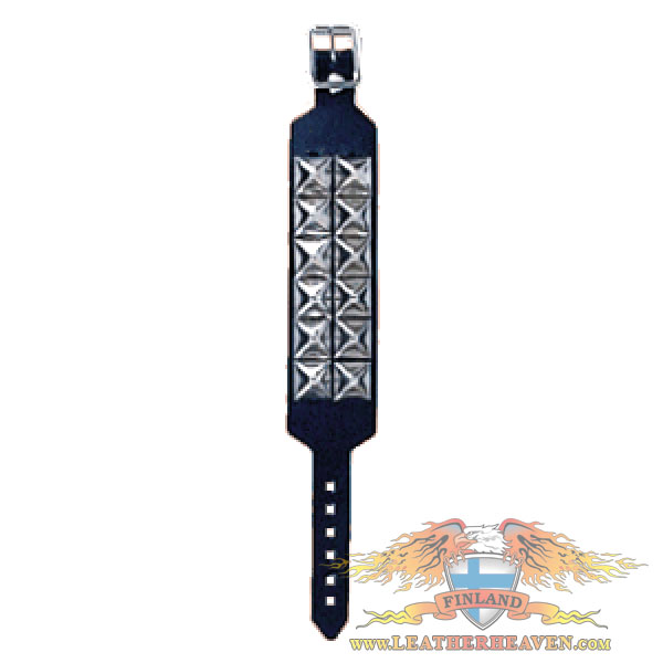 Niittiranneke, 2 rivinen pyramidi , musta nahkainen ranneke pyramidiniiteillä. Solkikiinnitys.