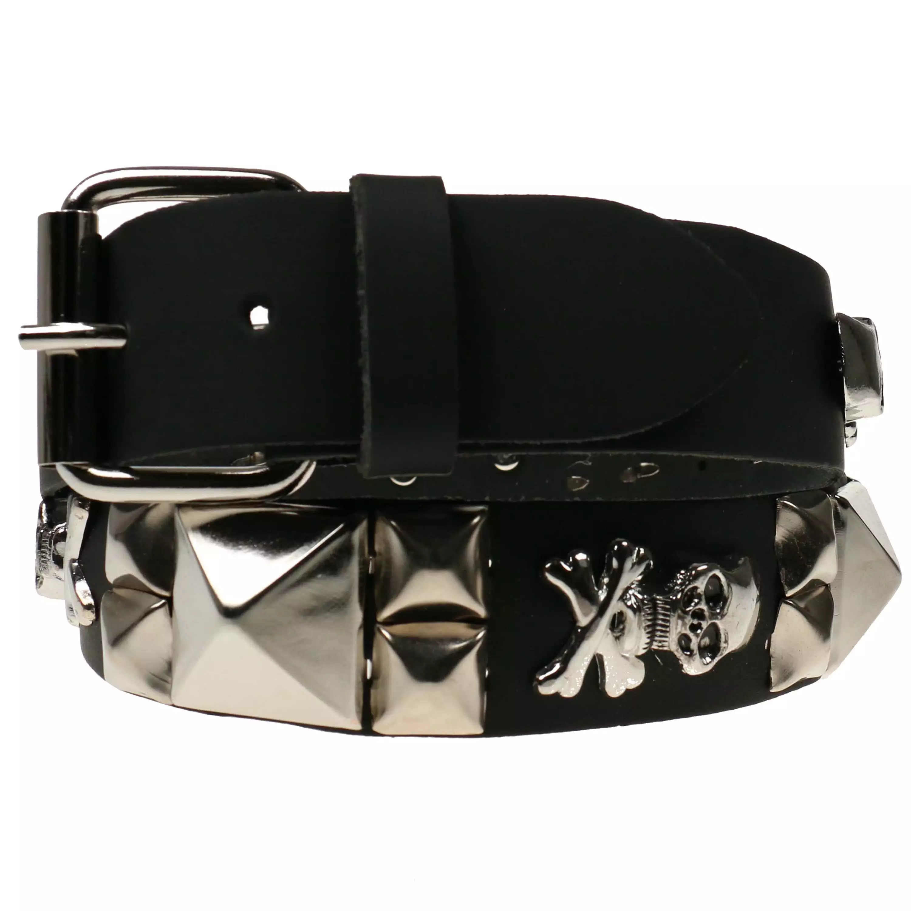 Nahkavyö niiteillä, iso pyramidi, 2-rivinen pyramidi ja pääkallo luilla.