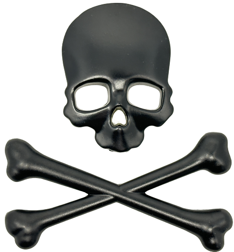 Pääkallo merkki luuta ja pääkallo mattamusta. Alumiinia pääallo 60x40mm ja luut 85x45mm