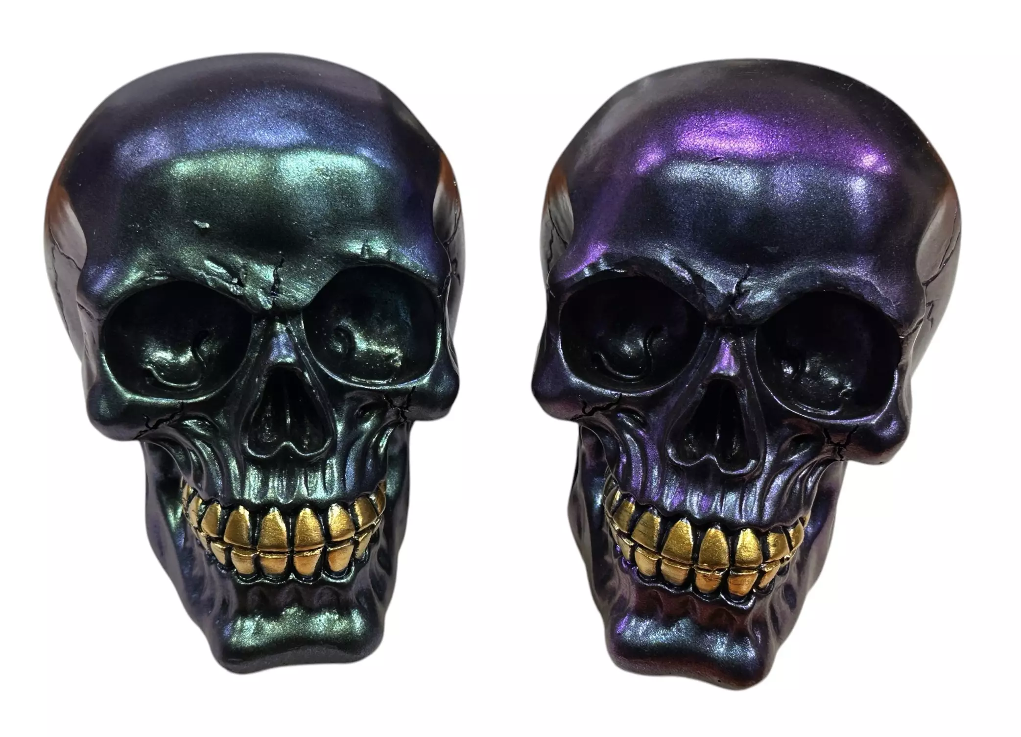 Pääkallo Kultahammas Metallinhohto, Halloween. Kultahampainen pääkallo, saatavana kahdessa eri metallinhohtoisessa värissä. Kallon mitat 11 x 12 x 14,5 cm. Materiaali resiini.