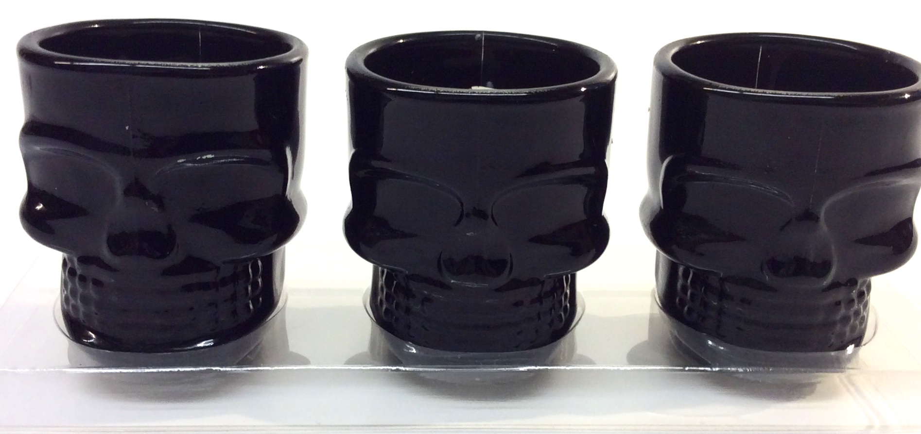 Pääkallo kynttilät 3 kpl lasia. Yhden lasipääkallon koko 2 x 6 cm.