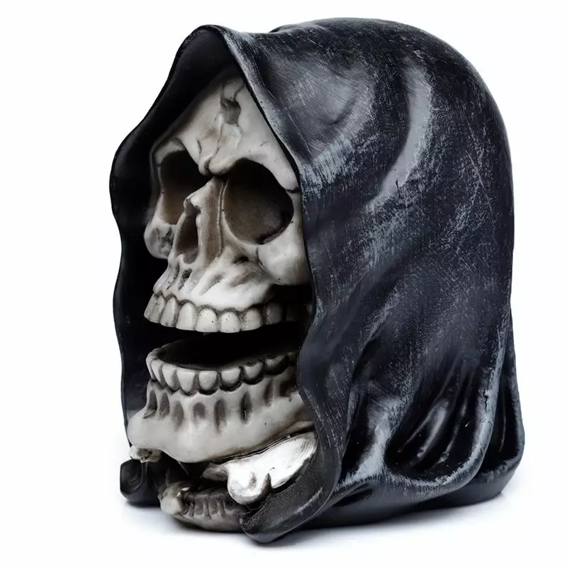 Pääkallo viikatemies, halloween. Kallon koko 8,5 x 12 x 11 cm. Materiaali resiini.