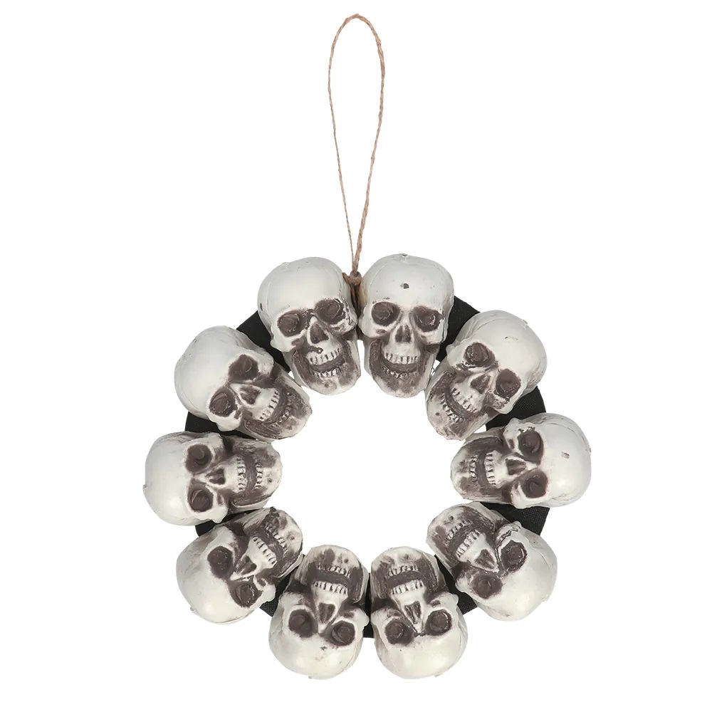 Pääkallokranssi 35 x 35 x 7 cm. Kymmenen pääkalloa ringissä toivottaa vieraasi tervetulleksi (tai menneeksi...). Kranssin halkaisija on n. 35 cm.