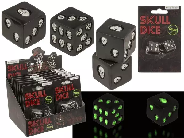 Pääkallonopat 2 kpl. Hohtavat pimeässä oltuaan ensin UV-valossa "latautumassa". Pakkauksesa kaksi noppaa.