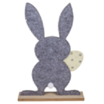 Pääsiäispupu, huopapupu. Iso huopapupu, joka seisoo puualustalla. Mitat 27 cm x 40 cm x 6 cm.