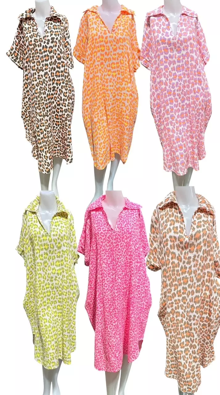 Paitamekko, Leopardi. Väljä, yhdenkoon lyhythihainen paitamekko. Helma on kaareva, sivusaumoissa on taskut ja pääntie on V:n mallinen edestä, muuten on paitakaulus. Mekkoa saatavilla erivärisillä leopardikuvioinnilla. Pituus niskasta helmaan n.110- 115 cm. Materiaali pehmeä ja kevyt 100 % puuvilla.