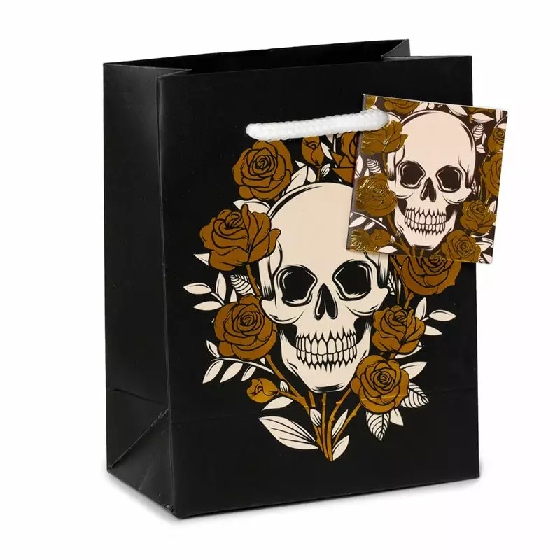 Paperikassi, Metallic Skulls and Roses. Pieni lahjakassi, mitat 11 x 14 x 6 cm.