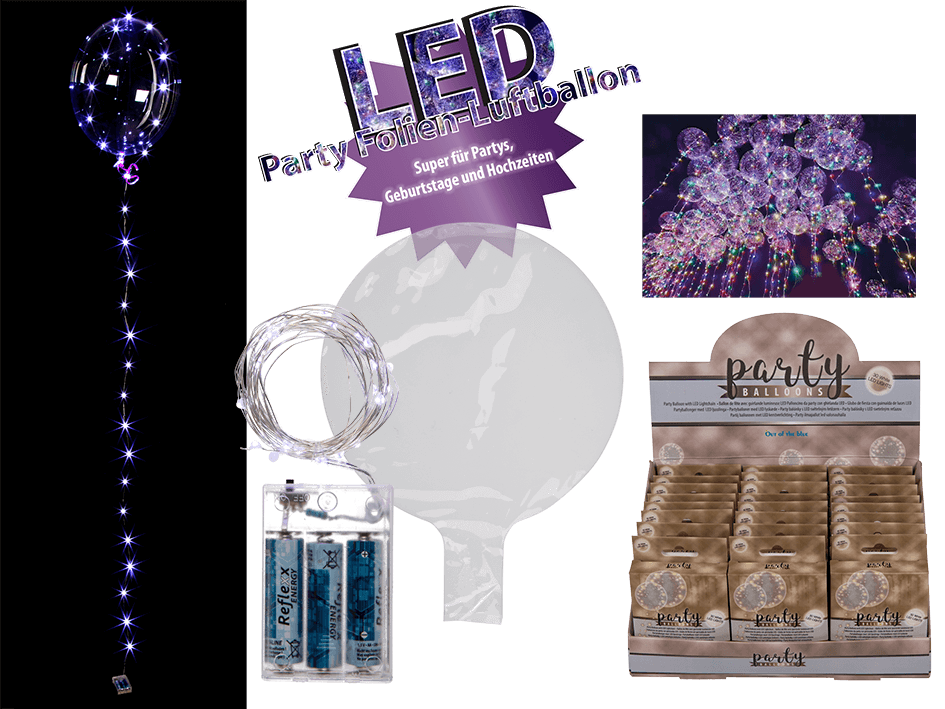 Party Balloons 30 valkoista lediä. N. 45 cm pallo (täytettynä) valoketjulla. Valoketjun pituus n. 3 metriä ja se sisältää 30 valkoista led-valoa. Toimii 3 x AA -paristoilla. Suositellaan täyttöä heliumilla.