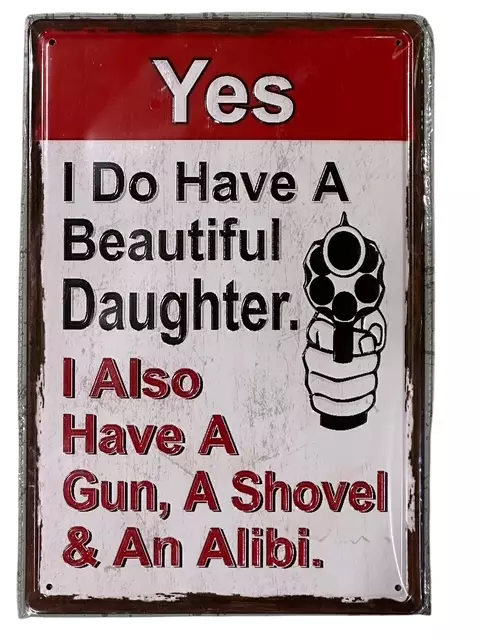 Peltikyltti Beautiful Daughter. Varoituskyltti kauniiden tyttärien vokottelijoille ; ). Mitat 20 x 30 cm. Kyltin jokaisessa kulmassa reiät seinälle ripustamisen helpottamiseksi.