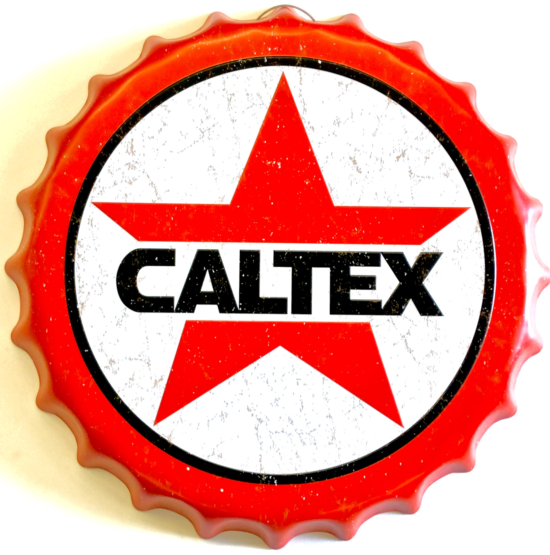 Peltikyltti, Caltex 40 cm. Peltikyltti logolla. Korkeus n. 43 cm ja leveys n. 40 cm. Peltikyltissä valmiina ripustuslenkki.