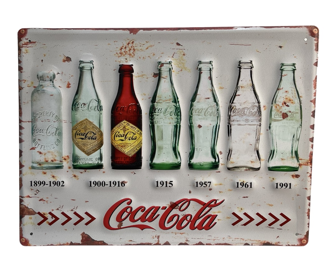 Peltikyltti Coca Cola since 1899. Kyltin kulmissa reiät kiinnitysruuveja varten, ruuvit eivät sisälly pakkaukseen.