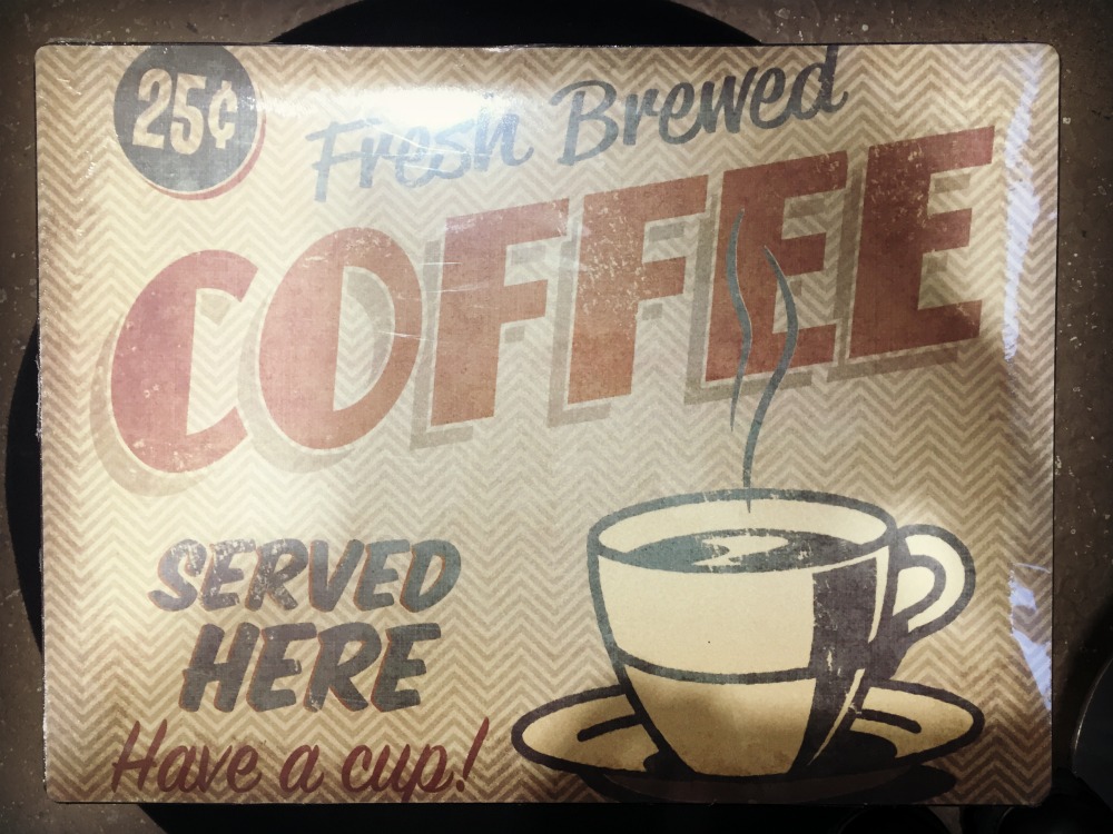 Peltikyltti, Fresh Brewed Coffee. Kyltin koko 40 x 30 cm.