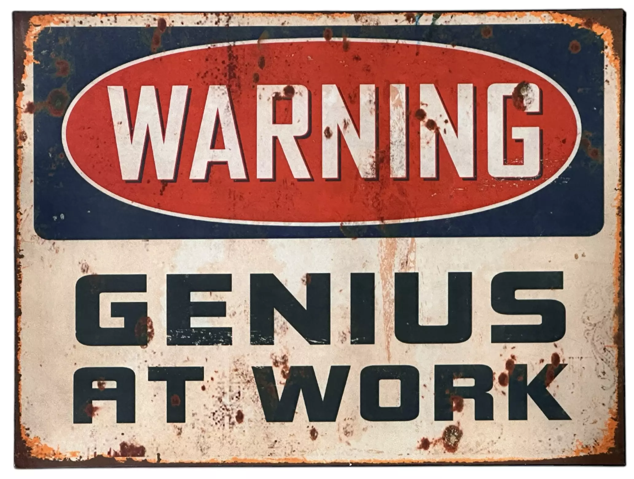 Peltikyltti Genius at Work. Mitat 40 x 30 cm. Seinälle kiinnitettävä kyltti, kyltin takana on yläkulmissaruuveille paikat.