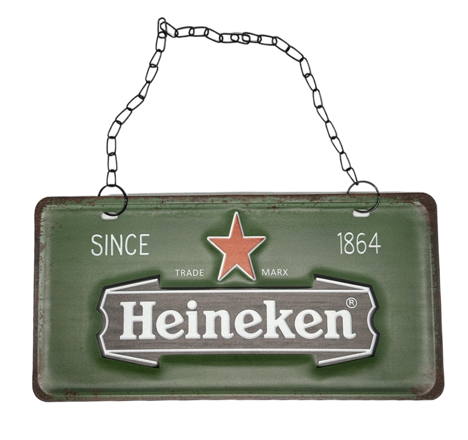 Peltikyltti Heineken. Ripustettava peltikyltti mustalla metalliketjulla. Kyltin mitat 31 x 15 cm.