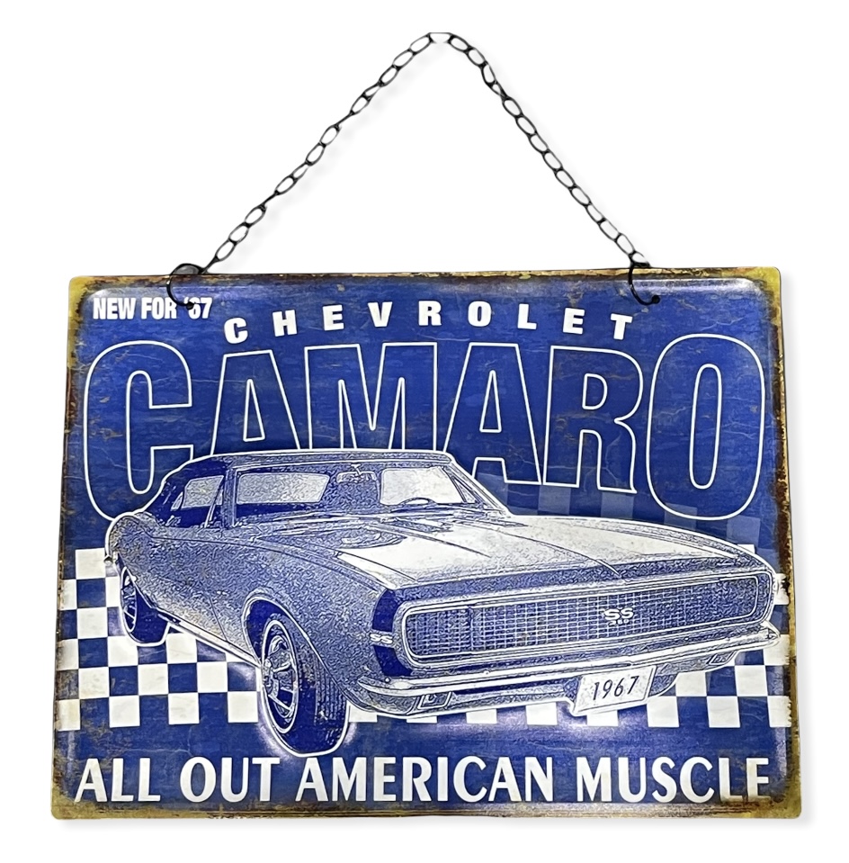 Peltikyltti ketjulla, Chevrolet Camaro sin. Mitat 40 cm x 30 cm. Vaakasuoranmallinen tyylikäs kyltti, mustalla ketjulla.
